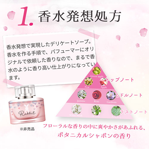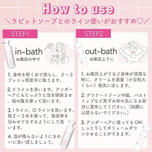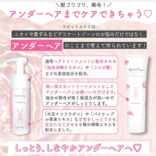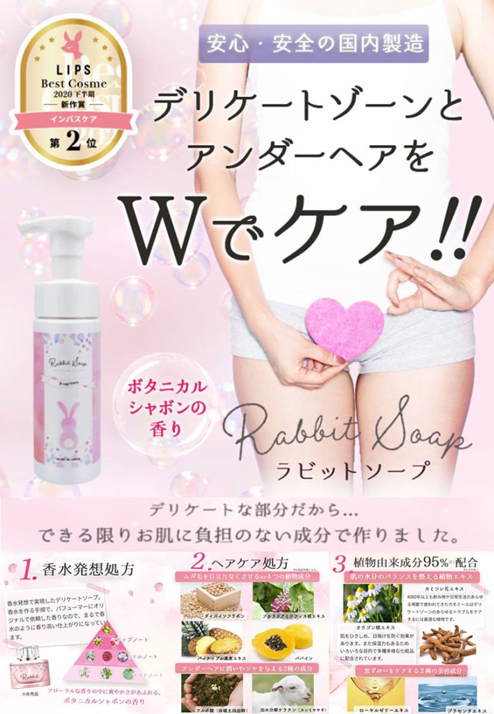 - Rabbit soap(ラビットソープ)は「うさぎのしっぽのようなフワフワなアンダーヘアへ」をコンセプトに、ニオイや黒ずみケアといった従来のデリケートゾーンソープの機能に加え「アンダーへア」までケアできる2in1デリケートソープです。