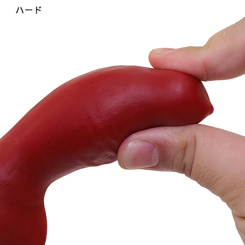 握るとグニャッと少し潰れる、柔らめの硬度。そのため、挿入など力のかかる時にはやや先端などの表面が少し潰れます。海外某ケモノディルドメーカーの「ミディアム」の硬さに類似しています。