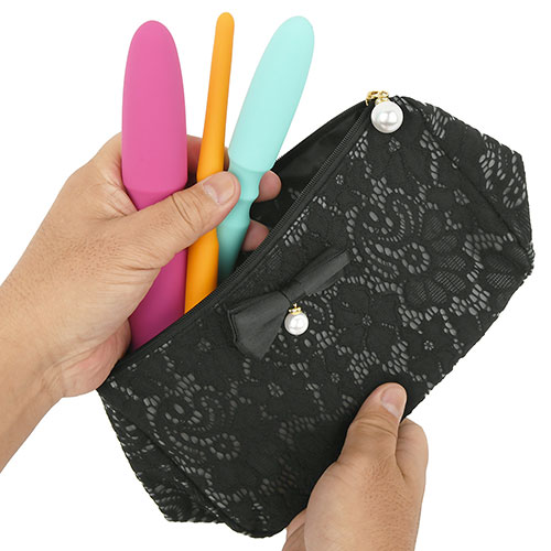 3本のダイレーターとジェル容器など、トレーニングに必要なもの一式が収納できる専用ポーチ付きです。